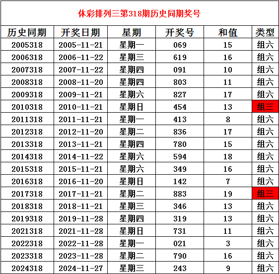 2025年11月28日排列三第318期开奖,历史同期分别开出奖号: