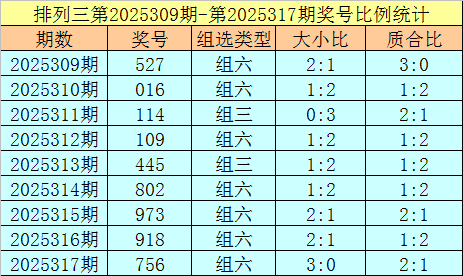 上期回顾:排列三第2025317奖号开出756,奖号质合比为2:1,大小比为3:0,跨度为2,类型为组六。